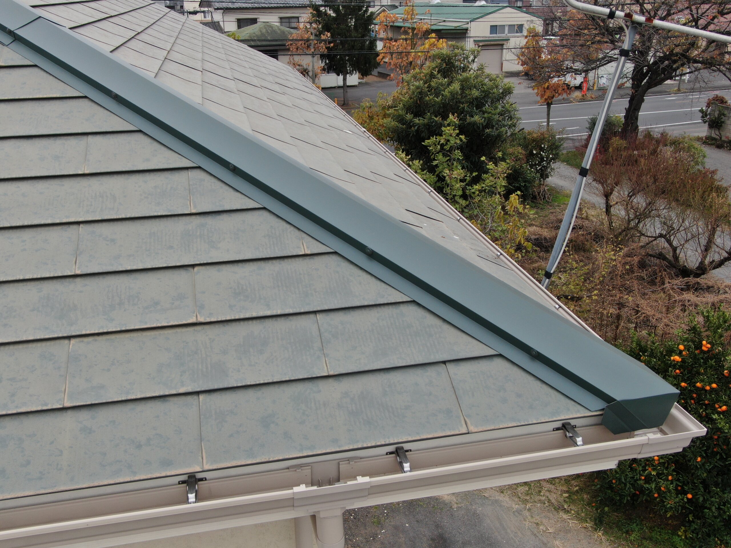 ①棟板金が風で飛んで隣の住宅に